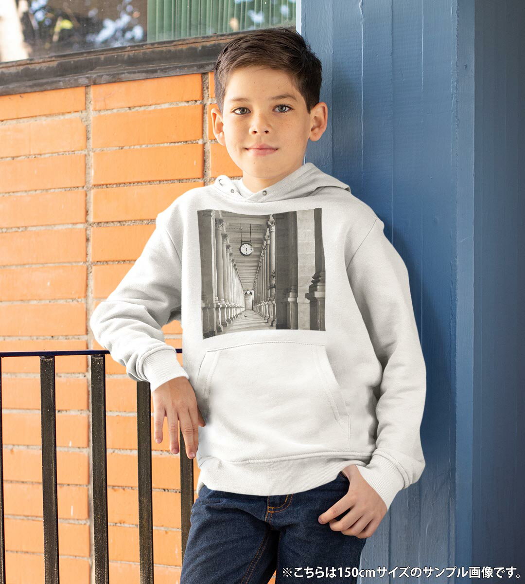 パーカー キッズ ホワイト グレー ブラック デザイン 110 130 150 parker hooded sweatshirt フーディ 白 黒 灰色 子供 男の子 女の子 007546 写真 モノクロ 時計 建物